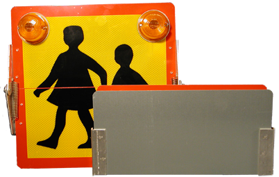 This school sign is intended to be mounted in the front and rear on vehicle, mainly busses. When the vehicle is not transporting school children the sign can easily be folded. The sign is made in aluminum and the School children symbol is made in a fluorescent reflective material.